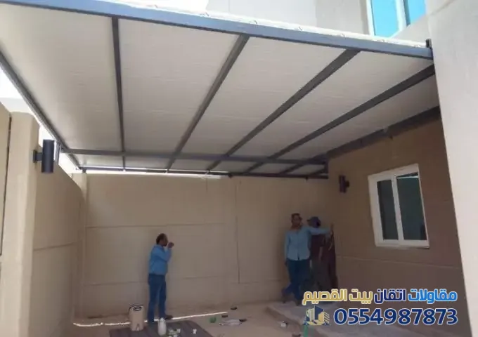 - تسقيف الملحق: تركيب ألواح السقف بميلان خفيف لتصريف المياه، مع إضافة "القرميد" أو "الشينكو" كطبقة جمالية اختيارية.