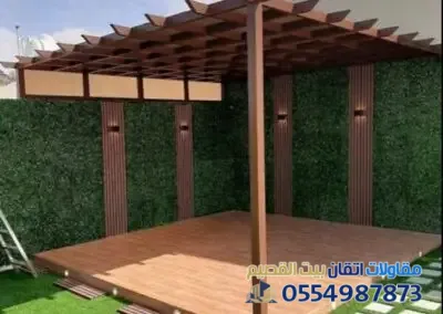 👉المستخدمة وفي تركيب البرجولات بناءً وأنواع مظلات أحواش على الغرض منها والميزانية المرصودة:1. البرجولات الخشبية (الكلاسيكية)