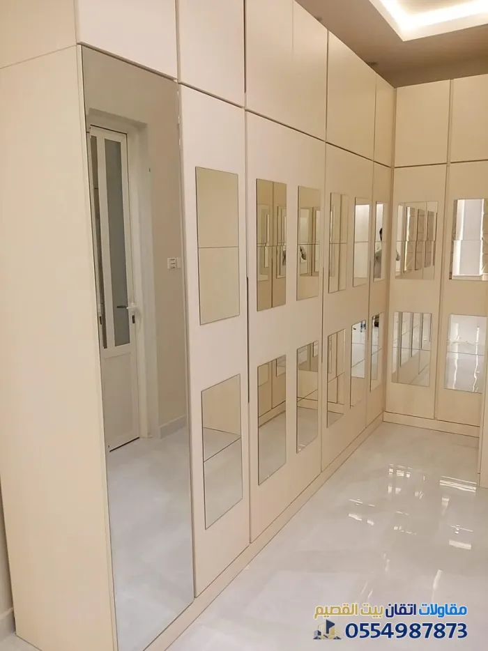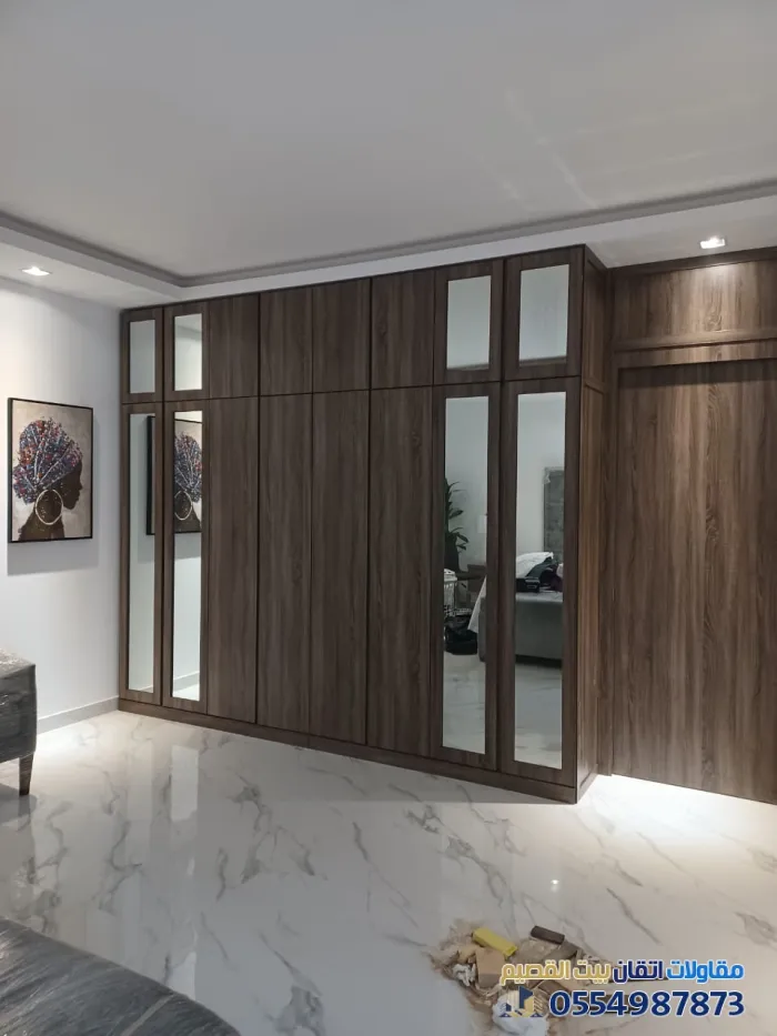- دواليب الملابس المدمجة: التي تستغل الجدار بالكامل من الأرض إلى السقف، مما يوفر مساحة تخزين هائلة وشكراً انسيابياً.